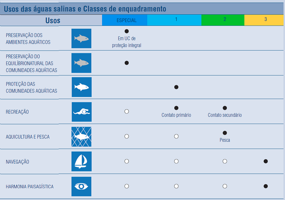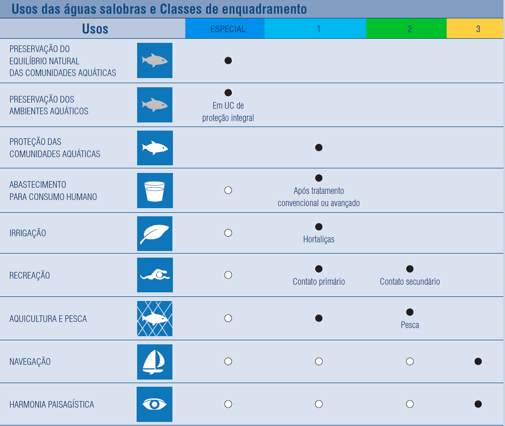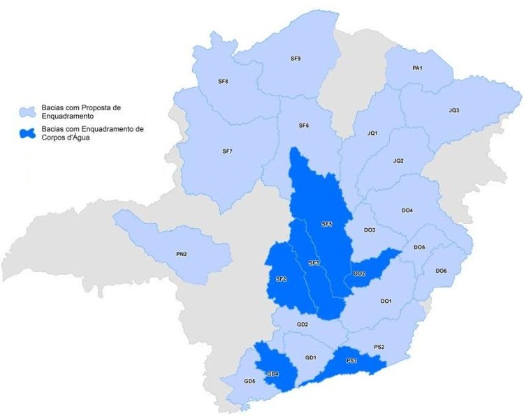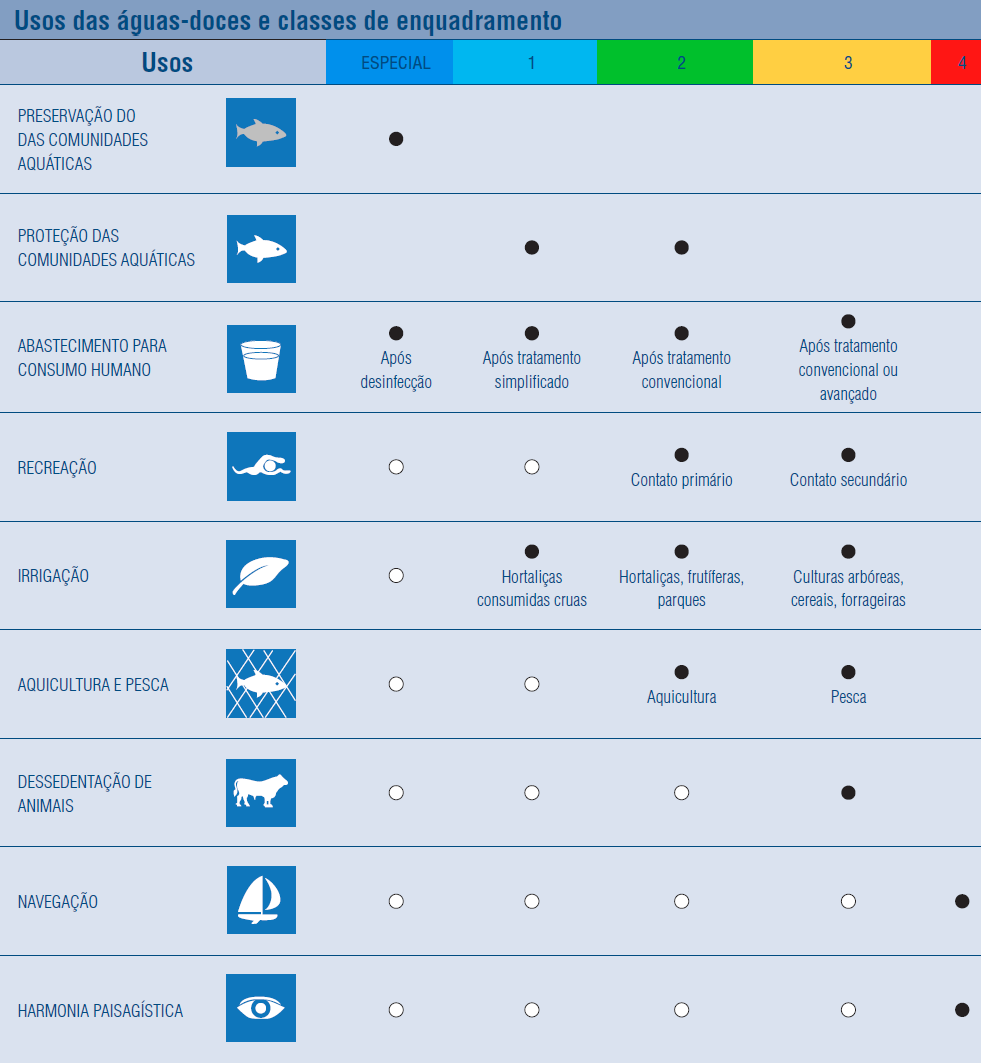 As classes de enquadramento e os usos respectivos a que se destinam as águas superficiais (doces, salobras e salinas) foram estabelecidos pela Resolução do Conselho Nacional do Meio Ambiente - CONAMA nº 357, de 17 de março de 2005 (vide abaixo figuras abaixo), sendo que, para o enquadramento das águas subterrâneas, essa classificação é disposta pela Resolução CONAMA nº 396, de 03 de abril de 2008. No caso das águas doces superficiais de domínio do Estado de Minas Gerais, a classificação dos corpos de água e as diretrizes ambientais para o seu enquadramento, bem como as condições e padrões para lançamento de efluentes, foram estabelecidas pela Deliberação Normativa Conjunta do Conselho Estadual de Política Ambiental – COPAM e do Conselho Estadual de Recursos Hídricos – CERH-MG n.º 01, de 05 de maio de 2008.